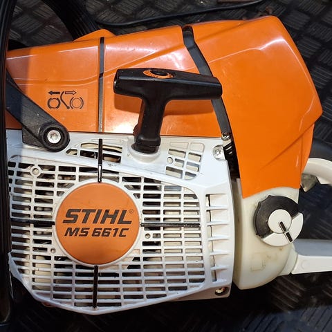 Stihl 070 motorsåg i orange färg. Bensindriven kedjesåg med svärd och kedja monterade. Sågen har främre och bakre handtag för tvåhandsfattning. Modell 070 är en äldre modell av Stihl-motorsåg, lämplig för kapning av trä och ved. Exakta tekniska data som effekt, cylindervolym och svärdlängd framgår inte av bilderna och kan kontrolleras mot tillverkarens specifikationer.