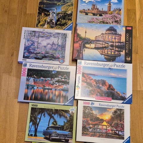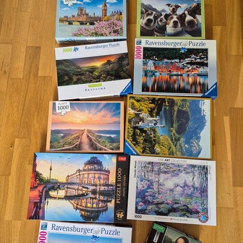 Ravensburger pussel med 1000 bitar. Motiven föreställer katter i korg, en stadsvy samt en blomsterträdgård. Pusslen är av kartong och är avsedda för vuxna eller äldre barn som gillar mer detaljerade motiv. Passar för inomhusbruk och kan läggas flera gånger eller ramas in när de är färdiga.