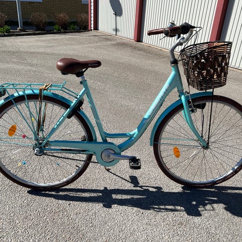 En fin damcykel eller juniorcykel i härligt blått och vitt från Solhaga 26tum. Shimano Nexus 3vxl. Frambroms. Led lyse fram och bak. Skärmar. Pakethållare. Cykelkorg. Kjolskydd. Ringklocka. Allt fungerar. En cykel som är redo att cykla på direkt. Bilderna tagna mars 2026.