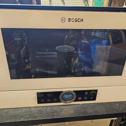Electrolux inbyggnadsmikrovågsugn, vit. Klisterrester på fronten behöver tas bort.