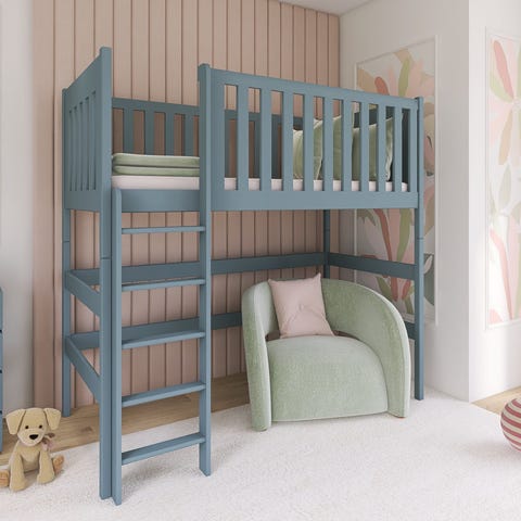 Loftsäng för barn i vitmålat trä. Sängen har hög skyddskant runt om och rak stege framtill. Konstruktionen ger utrymme under sängen för extra säng, förvaring eller lekplats. Passar i barnrum där man vill utnyttja golvytan effektivt. 90x200 cm läs mer om sängen på babyloves hemsida https://babylove.se/produkt/loftsang-till-barnrummet-lea/