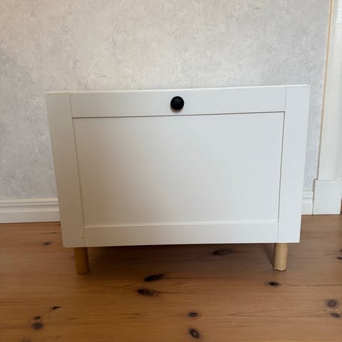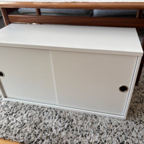 Vitt skåp 58 X 30 cm med dörr och hyllplan inne i skåpet. Tre korta vita golvgavlar 85 x 30 cm samt ett vitt hyllplan 58 x 30 cm. Allt i fint skick. Priset är för alla delar tillsammans.