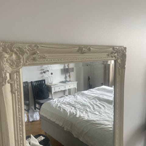 IKEA spegel med klädhängare i vit metall. Fristående golvspegel med ram som även fungerar som klädhängare. Baksidan har krokar för exempelvis smycken, väskor eller accessoarer. Passar i hall, sovrum eller klädkammare för förvaring och helkroppsspegel i ett.