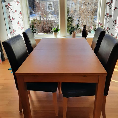 Säljer ett bord som är 90×90 cm och kan förlängas till cirka 170 cm. Bordet har bruksslitage med små märken och skav.