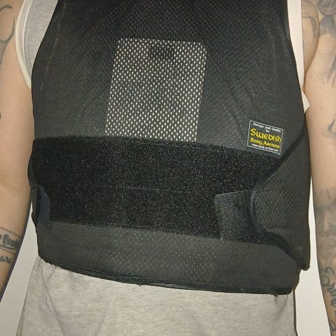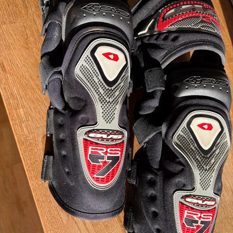 Ryggskydd i hårdplast och skum med grå skyddsplattor och röd kant. Justerbara axelremmar och midjebälte med kardborre för att hålla skyddet på plats.