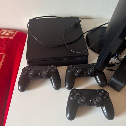 Sony Playstation 4 spelkonsol i svart färg. Konsolen är av standardmodell och lämpar sig för spel, film och streaming. På bilderna syns två handkontroller samt hörlurar som ingår. Anslutning sker via HDMI till TV eller skärm samt strömkabel. Passar för användning med kompatibla PS4-spel och tillbehör.