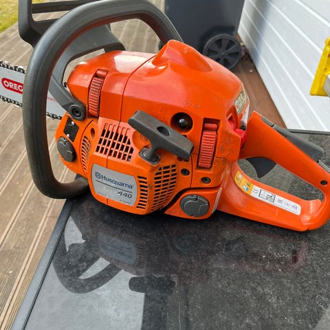Husqvarna motorsåg i orange färg. Bensindriven såg med svärd och kedja från Husqvarna. Utrustad med främre och bakre handtag, kedjeskydd och start-/stoppreglage. Lämplig för kapning av ved och allmänna sågjobb utomhus. Exakta tekniska specifikationer som cylindervolym, effekt och svärdlängd framgår inte av bilderna.
