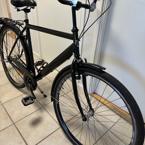 Crescent hybridcykel för unisex med ramstorlek 55 cm och 28"/700c-hjul. Cykeln har svart ram med raka styre, pakethållare bak, skärmar och stöd. Passar för pendling och vardagscykling på blandat underlag. Ramgeometrin är anpassad för bekväm sittställning och effektiv körning på väg och cykelbana.