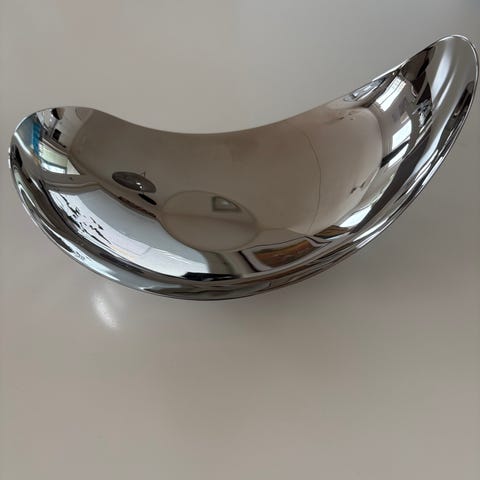 Georg Jensen skål i borstad rostfritt stål. Skålen har en organisk formoch är lämplig för servering av till exempel snacks eller tillbehör. Materialet är borstad rostfritt stål som är lätt att rengöra och passar i de flesta köks- och bordsdukningar.