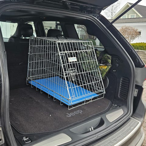 Djup nedtill 82cm, djup upptill 63cm, höjd 75cm, bredd 46cm.Jag har haft en liten hund i den, därför har jag byggt upp den med frigolit men det går att ta bort.