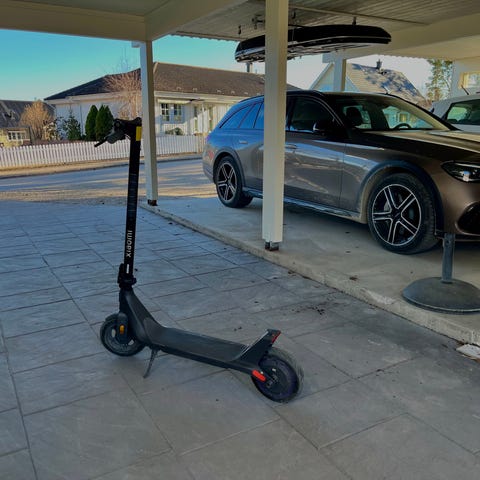 Elsparkcykel i svart färg. Modellen har ståplatta, styre med handtag och fram- och bakhjul anpassade för körning på hårda underlag. Lämplig för kortare transporter och vardagspendling. Drivs av elmotor och är avsedd för en stående förare.