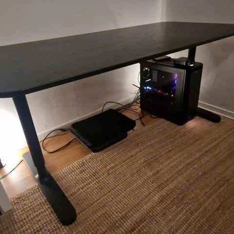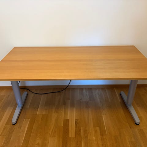 IKEA Bekant skrivbord med svarta ben och skiva i björkfanér. Inte den elektriska höj- och sänkbara modellen. Går dock att ställa in höjd manuellt.