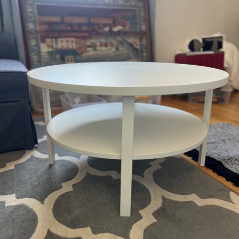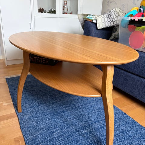 Sparsamt använt från Möbelhuset. Bordsskiva och hylla i fanerad vitbetsad ek med massiva ben.