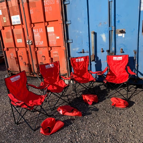 Hopfällbart campingbord och pallar set i lättviktskonstruktion. Bord med vit bordsskiva och röd ram. Flera hopfällbara pallar med sitsar i textil, både mönstrade flerfärgade och vita/grå. Passar för camping, utflykter, picknick eller som extra sittplatser utomhus. Enkelt att fälla ihop och förvara när det inte används.