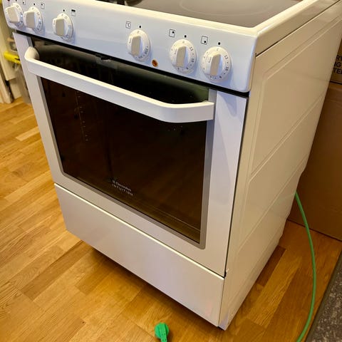 spishäll med ugn i vit färg. Fristående enhet med glaskeramisk häll ovanpå ugn med front i glas och metall. Utrustad med vredreglage och digital display på frontpanelen. Passar för installation i kök där både häll och ugn önskas i en och samma enhet.