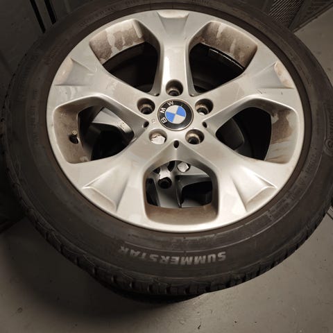 Däck och fälgar är från 2017, så långt ifrån nya men funkar kanske på släp eller något långsamtgående. Fälgarna har mycket ytrost och är bättrade för hand. Bilden visar det däck som jag bedömer har minst mönster kvar.
