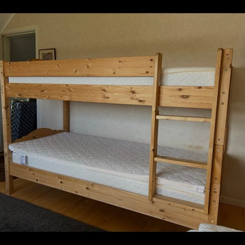 Våningssäng Nora från Mio. Övre bädd är 90 cm bred och den nedre är 120 cm bred. Madrasser från Nirva ingår. Sängen står i en sommarstuga så den har varit mycket sparsamt använd.