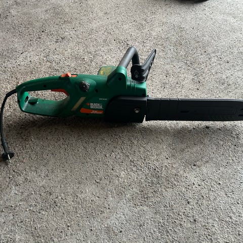 Black & Decker motorsåg i grön färg. El- eller batteridriven kedjesåg med svärd och medföljande svärdsskydd. Lämplig för kapning av grenar, mindre träd och ved runt trädgård och tomt. Ergonomiskt handtag och skydd över kedjan för säkrare hantering. Exakta tekniska data som effekt, svärdlängd och strömkälla framgår inte av bilderna och bör kontrolleras vid behov.
