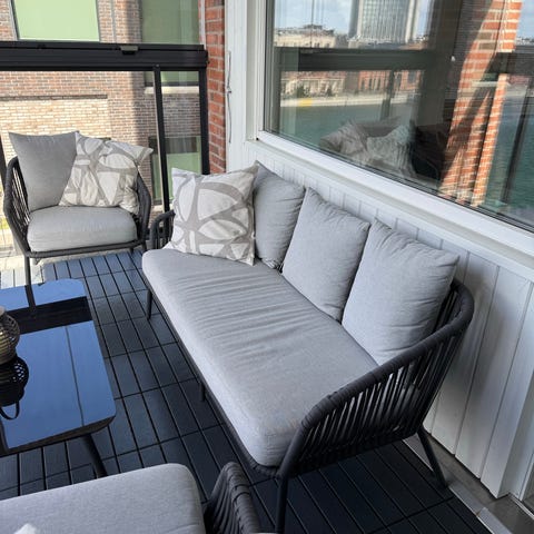 Dynorna är i grå textil och täcker både sits och rygg. Passar exempelvis på altan, balkong eller uteplats.