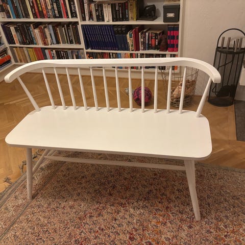 Äldre kökssoffa. Vitmålad, lite småskav finns. Annars hel och fin. Förvaring i sitsen. Ca 190 cm bred.
