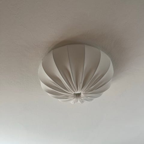 Artek vägglampa formgiven av Alvar Aalto. Lampan är väggmonterad och har en konisk, skiktad form i vit färg som sprider ljuset uppåt och nedåt mot väggen. Passar för belysning i exempelvis hall, vardagsrum eller sovrum. Materialet framstår som metall med lackerad yta. Strömkabeln är synlig på sidan enligt bilderna.