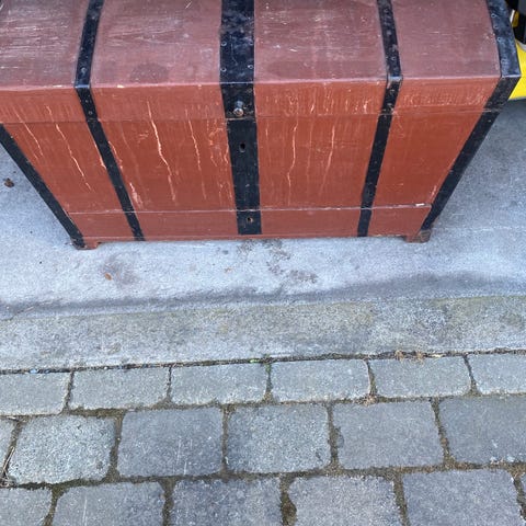 Kistan har förstärkningar i trä och metallband runt om samt metallbeslag och lås på framsidan.