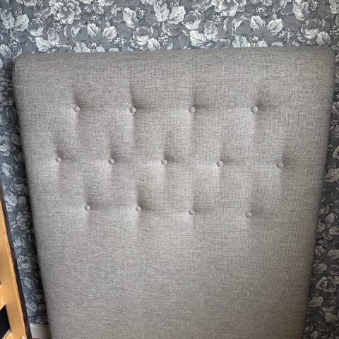 En mycket fin, grå sänggavel som passar till en 120 cm bred säng. Har används i ungefär 2,5 år men ser så gott som oanvänd ut. Höjden 132 cm inkluderar benen som i sig är 14 cm.