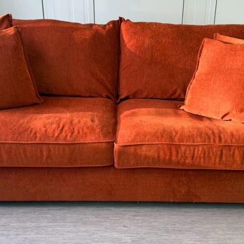 Mio soffa klädd i rosa sammetsliknande tyg. Soffan har två sittdynor, knapptuftad rygg och armstöd i ett stycke som ger en omfamnande form. Ben i mörkt trä eller metall. En soffa med tre sits men passar ca 5. En soffa med två sits och två fåtöljer.