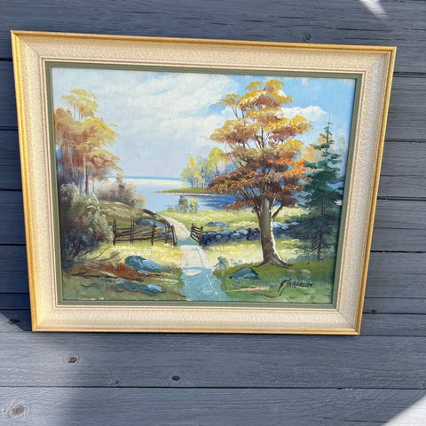 A. Phul oljemålning med landskapsmotiv föreställande en sjö med omgivande natur och björkar i förgrunden. Tavlan är signerad A. Phul och daterad 1951. Målningen är inramad i en träram med profilerad kant. Passar som väggdekoration i exempelvis vardagsrum, hall eller sommarstuga.