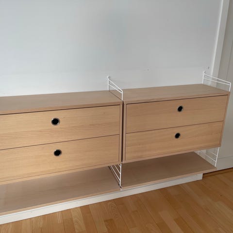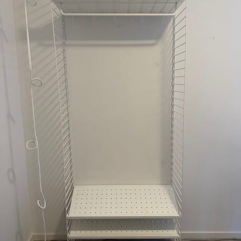 String hallmöbel i vitt. Hängaren har en hylla överst, 5 krokar och en stång under och två hyllor för skor längst ner. Höjd 200cm, 78cm bred och 30cm djup. Finns även 2 uppsättningar med String organizers. Allt är i gott skick. Den är nedmonterad men går att se. Finns i Upplands Väsby.