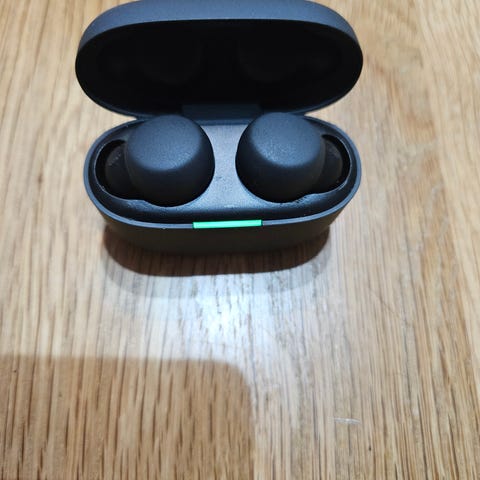 Ett par trådlösa hörlurar från Sony, modell WF-1000XM4. Hörlurarna kommer med ett laddningsfodral. Fodralet har en USB-C-port för laddning. Knappt använda, skick som visas.