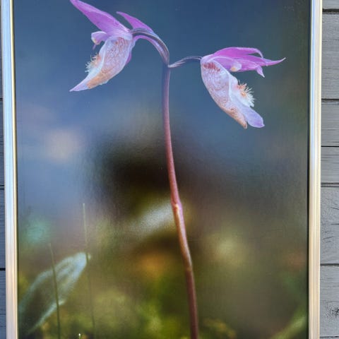 Landskapsmålning som föreställer en naturvy med träd, stig och vatten i bakgrunden. Tavlan är målad i färg på duk eller pannå och är försedd med en rektangulär ram i ljus ton. I nedre högra hörnet finns en oläslig signatur. Passar som väggdekoration i exempelvis vardagsrum, hall eller sommarstuga.