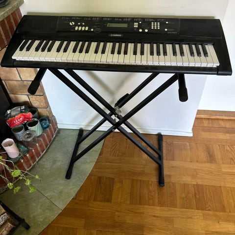Digitalpiano med klaviatur i fullstorlek, placerat på ett X-stativ. Pianot har flera funktionsknappar och display på ovansidan samt notställ. Medföljer gör hörlurar och nätadapter som syns på bilden. Passar för hemmabruk, övning och enklare musikproduktion.