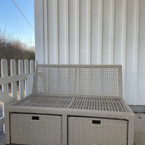 Balkongmöbelset bestående av en mindre soffa, två fåtöljer och ett rektangulärt bord. Dynorna är i grått tyg och möblerna har mörk stomme med flätad/öppen design i rygg- och sidostöd. Passar för användning på balkong eller mindre uteplats som sittgrupp för flera personer.