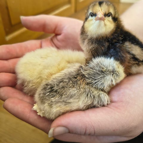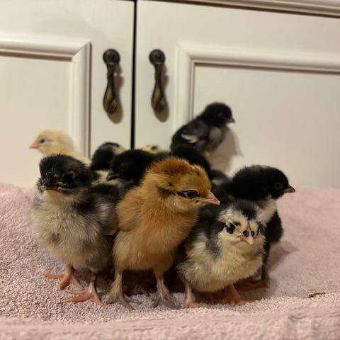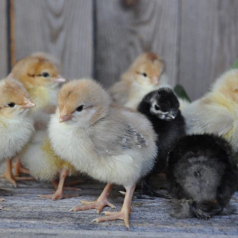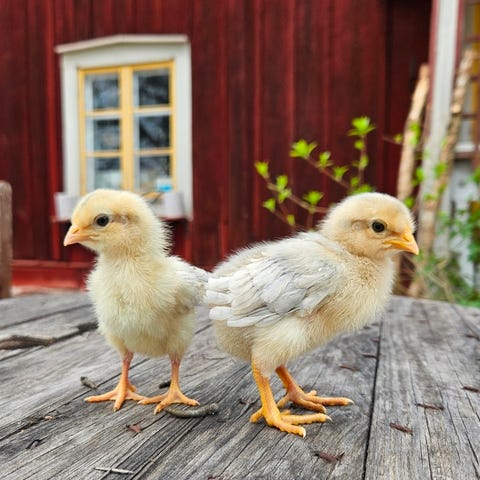 Kycklingar i blandade färger, korsningar bresse, wyandotte, bovan.