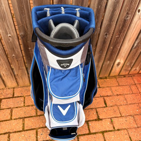 Callaway golfbag standbag i svart färg. Väskan har bärremmar för enkel transport och utfällbara ben för att kunna stå stabilt på marken. Flera fickor för förvaring av bollar, tillbehör och personliga saker. Topp med flera fack för organisering av klubborna. Passar för golfspelare som vill bära sin utrustning på banan.Nypris ligger runt 2500kr!