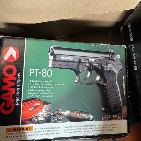 Extra kolsyrepatroner, tavlor och en nästan full ask med skott medföljer.