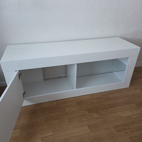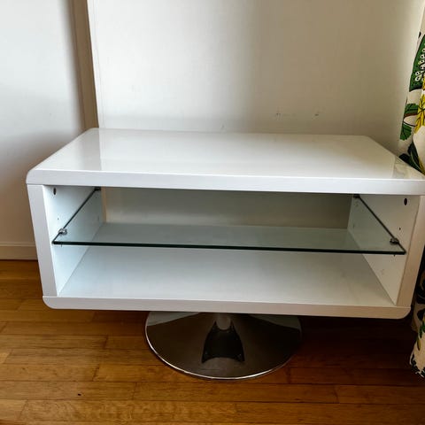 Klassisk mediabänk i glas och metall från IKEA med två hyllplan.