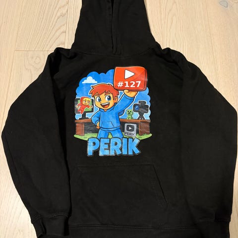Svart hoodie med tryck av tecknade figurer och texten ”PERIK” på framsidan. Hoodien har en ficka fram och en huva. Fin i färgen och helt tryck. Perfekt för Perik fans! Detta tryck finns inte att köpa längre, är slutsålt och den kom i numrerad utgåva