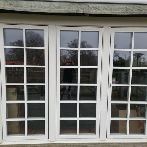 Altandörr i form av dubbeldörr med glasade överdelar och fyllningar i underdelarna. Dörren är tillverkad i PVC och har glasrutor som släpper in ljus. Passar som utgång mot altan, balkong eller trädgård i bostad eller fritidshus. Dörren är försedd med handtag och lås på ena dörrhalvan och gångjärn på sidorna. Färg utvändigt i mörk träton och invändigt i vit. Monteras ned av snickare vecka 17.