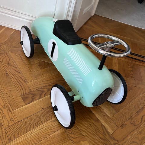 Grå gåbil till barn. Också snygg att ha som inredning. I grå metall