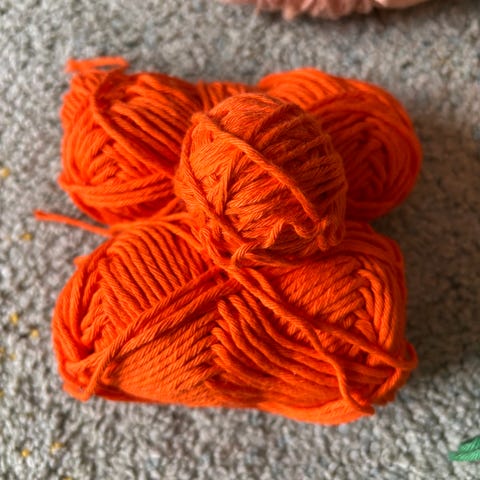 Trikågarn. Färgerna är grönt, gult, orange och ljusgult. Garnet är av trikåtyp, lämpligt för exempelvis virkning eller stickning av inredningsdetaljer som korgar, mattor eller liknande projekt. Säljs som blandat parti enligt bilderna.