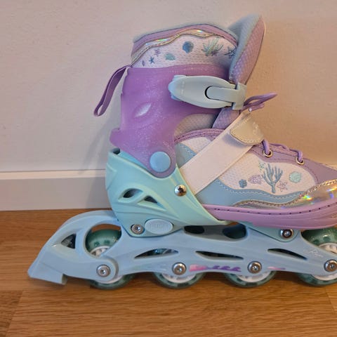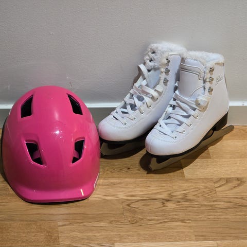 Säljer en rosa hjälm och ett par skridskor i lila, grått och vitt. Skridskorna har spännen så att den passar flera storlekar, snörning för bra passform och hjälmen har blått foder på insidan. Perfekt för dig som vill åka skridskor med stil.