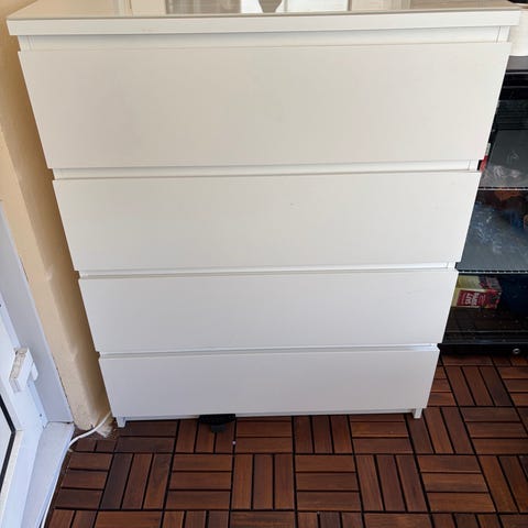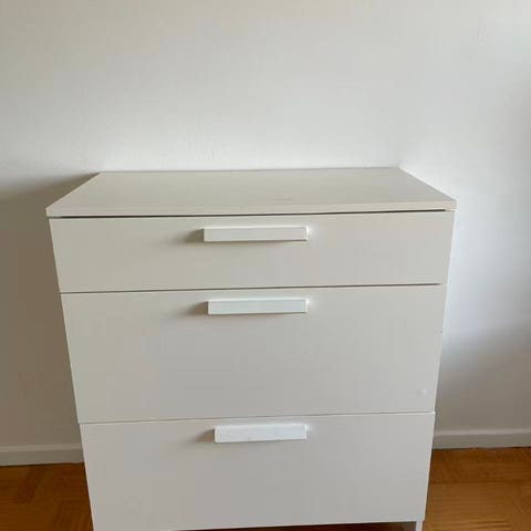 Ikea malm byrå med 3 lådor och glasskiva. Liten skada på underdelen se bild . Se bild 4&5. Hämtas i Malmö.