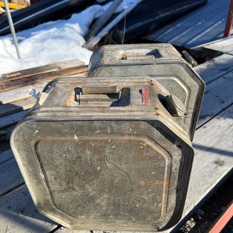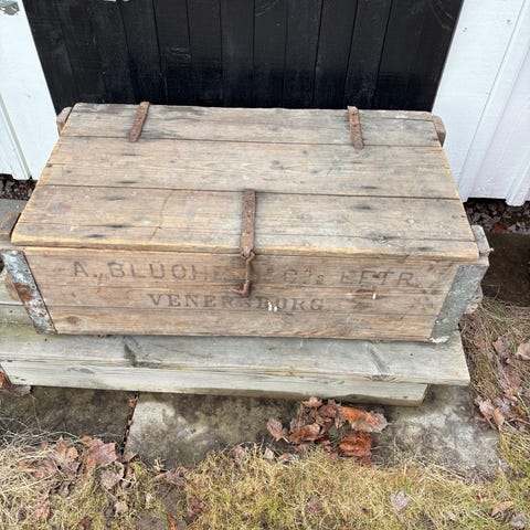 Antik metall-låda med fin patina och klassisk grafik i rött, gult och svart.