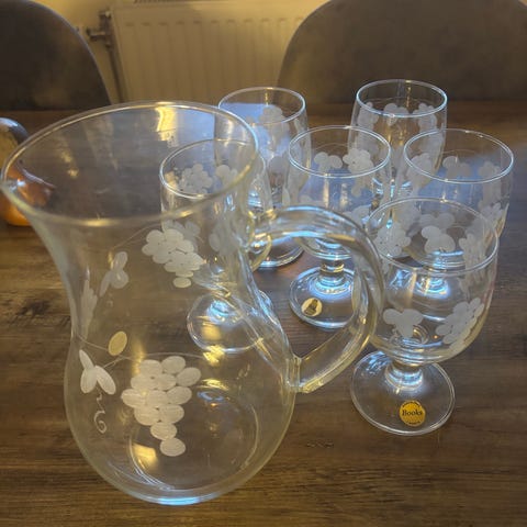 Karaff och vinglas i klarglas med målat vindruvsmotiv i lila och grönt. Setet består av en karaff och tre vinglas på fot. Glasen har rund kupa och slät fot, karaffen har bred botten och smal hals. Passar för servering av vin eller andra drycker vid måltider och dukning.