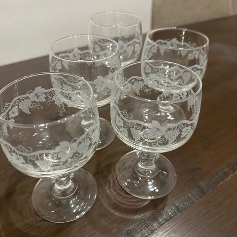 Likörglas på fot i klarglas med graverat mönster. Glasen är små och lämpar sig för servering av likör, snaps eller andra starkare drycker. Säljes som set enligt bilderna.