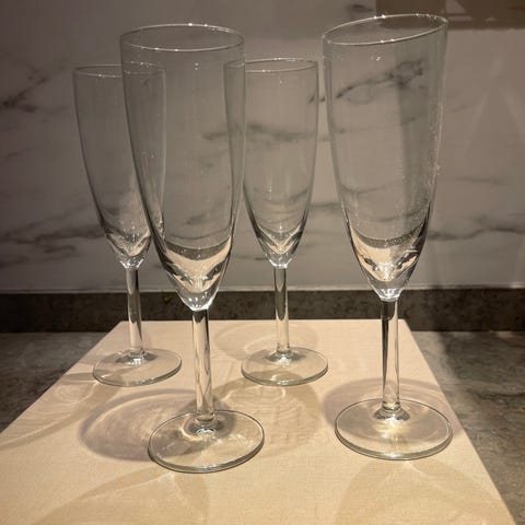 Champagneglas i klart glas med hög, smal kupa och lång fot. Passar för servering av mousserande vin eller andra drycker. Säljs som set enligt bild.