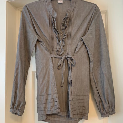 Helt ny, blå randig skjorta från Davida. Skjortan knyts baktill, vilket ger en smickrande silhuett. Tillverkad i 100 % bomull.