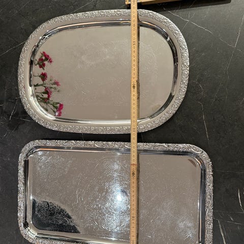 Rektangulär serveringsbricka i metall med guldfärgad kant och handtag. Brickan har dekorativt mönstrad yta och profilerad, ornamenterad kant runtom. Utrustad med två handtag i samma stil för enkel förflyttning. Lämplig för servering av dryck, glas, koppar eller som dekorationsbricka på bord eller bänk.